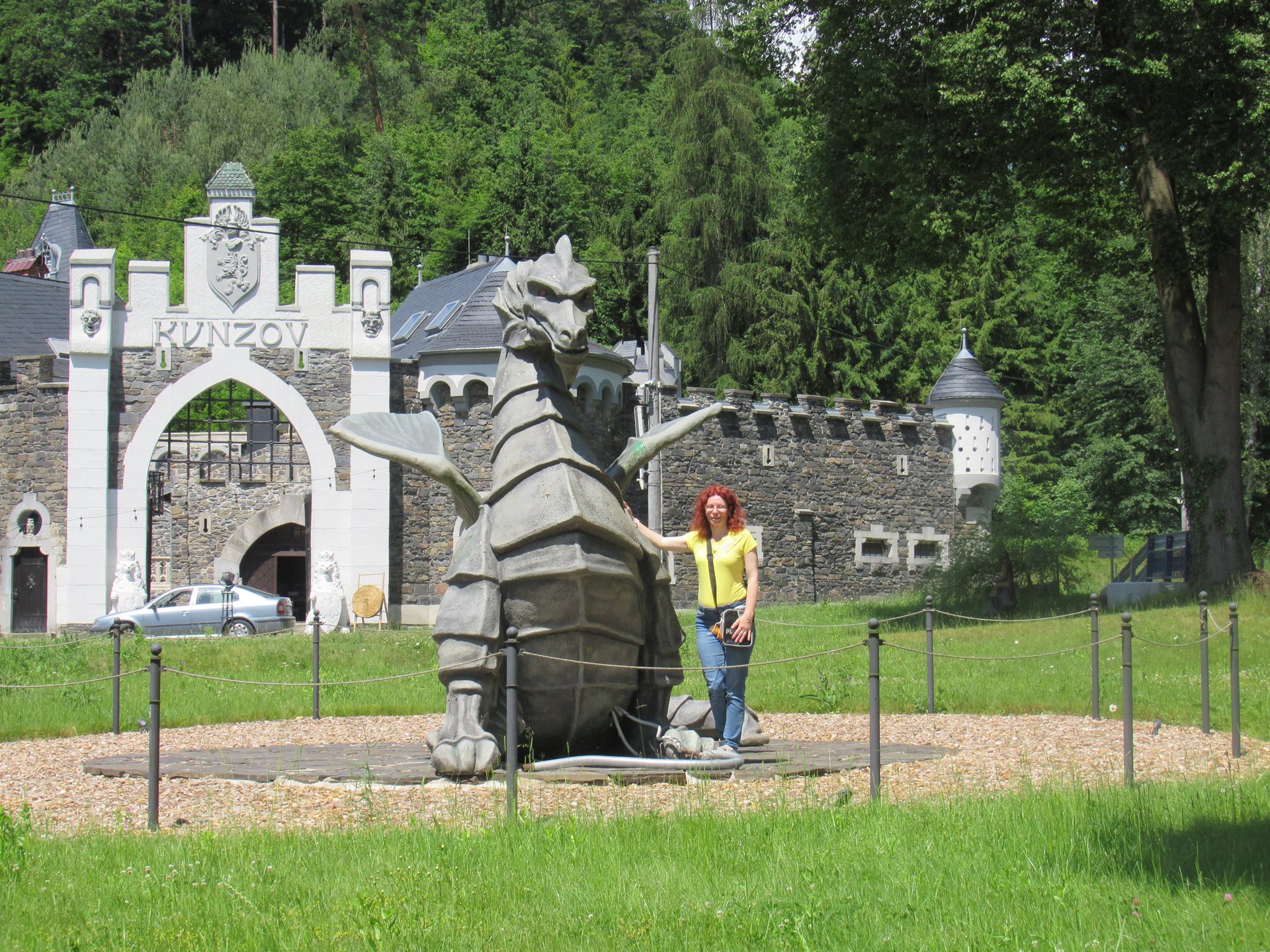 Na Kunzově jsme si obešli areál hradu - bylo to jak v pohádce, pohladili jsem si draka a osvěžili se v potůčku.